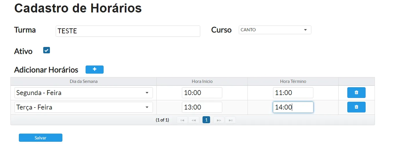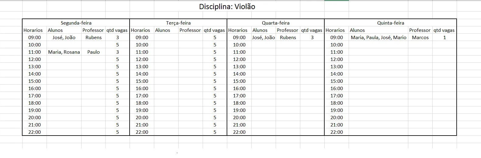 Boa noite, preciso desenvolver uma agenda para uma escola de musica, então fiz desse jeito: 1º cadastrar o curso, 2º cadastrar os horários desse curso criando as turmas e por fim cadastrando os alunos formando as aulas, o cliente não gostou de adicionar um horário para cada curso pediu para cadastrar os horários de uma vez, procurei algum exemplo para ter alguma ideia e não encontrei alguém teria um exemplo de agendamento de aulas para poder passar, preciso cadastrar uma sala com vagas disponíveis e salvar os alunos nesta sala com o curso escolhido.
