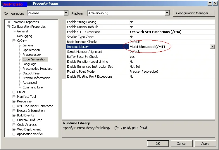 Veja se é possível alterar a opção de compilação, trocando de “Multithreaded DLL” para “Multithreaded”.