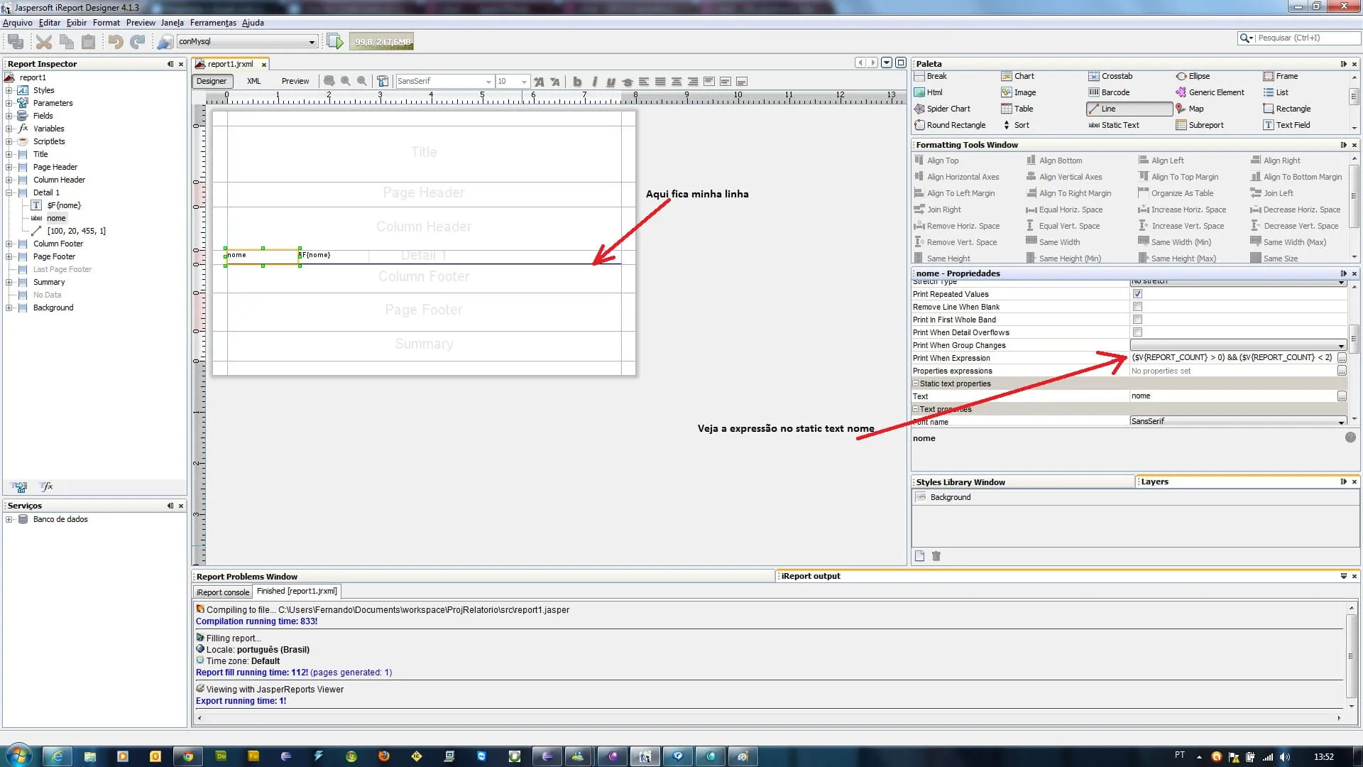 Clica em cima do static text frase e vai na guia propriedades em procura por Print When Expression e adiciona Essa Expressão: