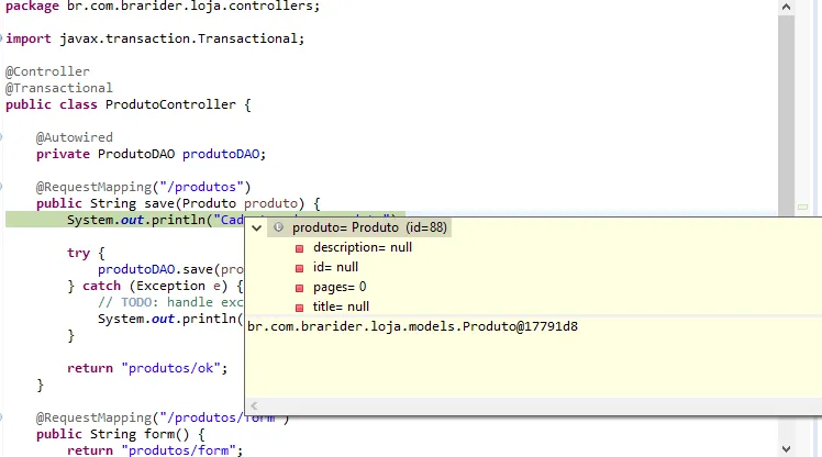 Estou iniciando um projeto usando spring, no primeiro teste na gravação de uma jsp o objeto retorna vazio, ocasionando erro: