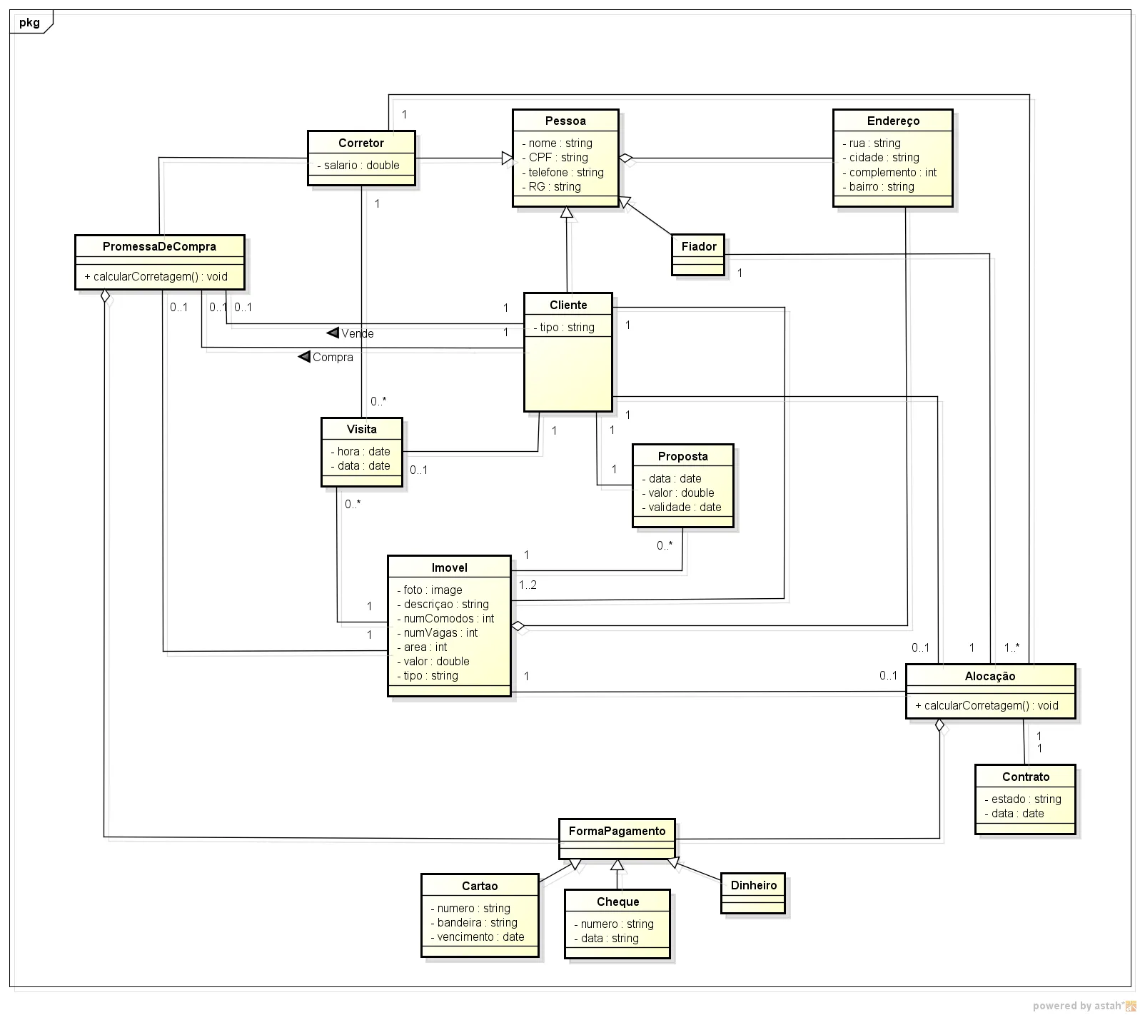 Os corretores possuem salário fixo e recebem também comissão de 10% para imóveis vendidos e de 2% para cada imóvel locado. Entretanto, o sistema não fará a folha de pagamento dos funcionários mas, ao registrar uma venda ou locação, deverá armazenar o valor da comissão do corretor.