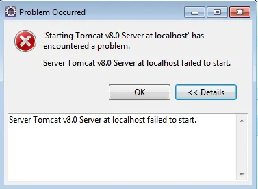nov 18, 2016 7:30:35 PM org.apache.catalina.startup.Catalina start GRAVE: The required Server component failed to start so Tomcat is unable to start. org.apache.catalina.LifecycleException: Failed to start component [StandardServer[8005]] at org.apache.catalina.util.LifecycleBase.start(LifecycleBase.java:162) at org.apache.catalina.startup.Catalina.start(Catalina.java:629) at sun.reflect.NativeMethodAccessorImpl.invoke0(Native Method) at sun.reflect.NativeMethodAccessorImpl.invoke(Unknown Source) at sun.reflect.DelegatingMethodAccessorImpl.invoke(Unknown Source) at java.lang.reflect.Method.invoke(Unknown Source) at org.apache.catalina.startup.Bootstrap.start(Bootstrap.java:351) at org.apache.catalina.startup.Bootstrap.main(Bootstrap.java:485) Caused by: org.apache.catalina.LifecycleException: Failed to start component [StandardService[Catalina]] at org.apache.catalina.util.LifecycleBase.start(LifecycleBase.java:162) at org.apache.catalina.core.StandardServer.startInternal(StandardServer.java:789) at org.apache.catalina.util.LifecycleBase.start(LifecycleBase.java:145) … 7 more Caused by: org.apache.catalina.LifecycleException: Failed to start component [StandardEngine[Catalina]] at org.apache.catalina.util.LifecycleBase.start(LifecycleBase.java:162) at org.apache.catalina.core.StandardService.startInternal(StandardService.java:441) at org.apache.catalina.util.LifecycleBase.start(LifecycleBase.java:145) … 9 more Caused by: org.apache.catalina.LifecycleException: A child container failed during start at org.apache.catalina.core.ContainerBase.startInternal(ContainerBase.java:951) at org.apache.catalina.core.StandardEngine.startInternal(StandardEngine.java:262) at org.apache.catalina.util.LifecycleBase.start(LifecycleBase.java:145) … 11 more