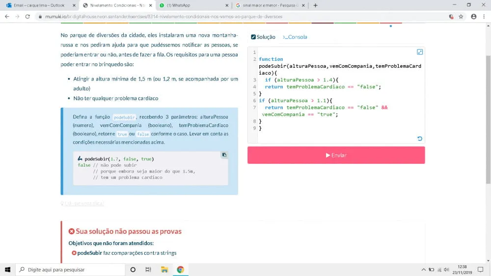 No parque de diversões da cidade, eles instalaram uma nova montanha-russa e nos pediram ajuda para que pudéssemos notificar as pessoas, se poderiam entrar ou não, antes de fazer a fila. Os requisitos para uma pessoa poder entrar no brinquedo são: