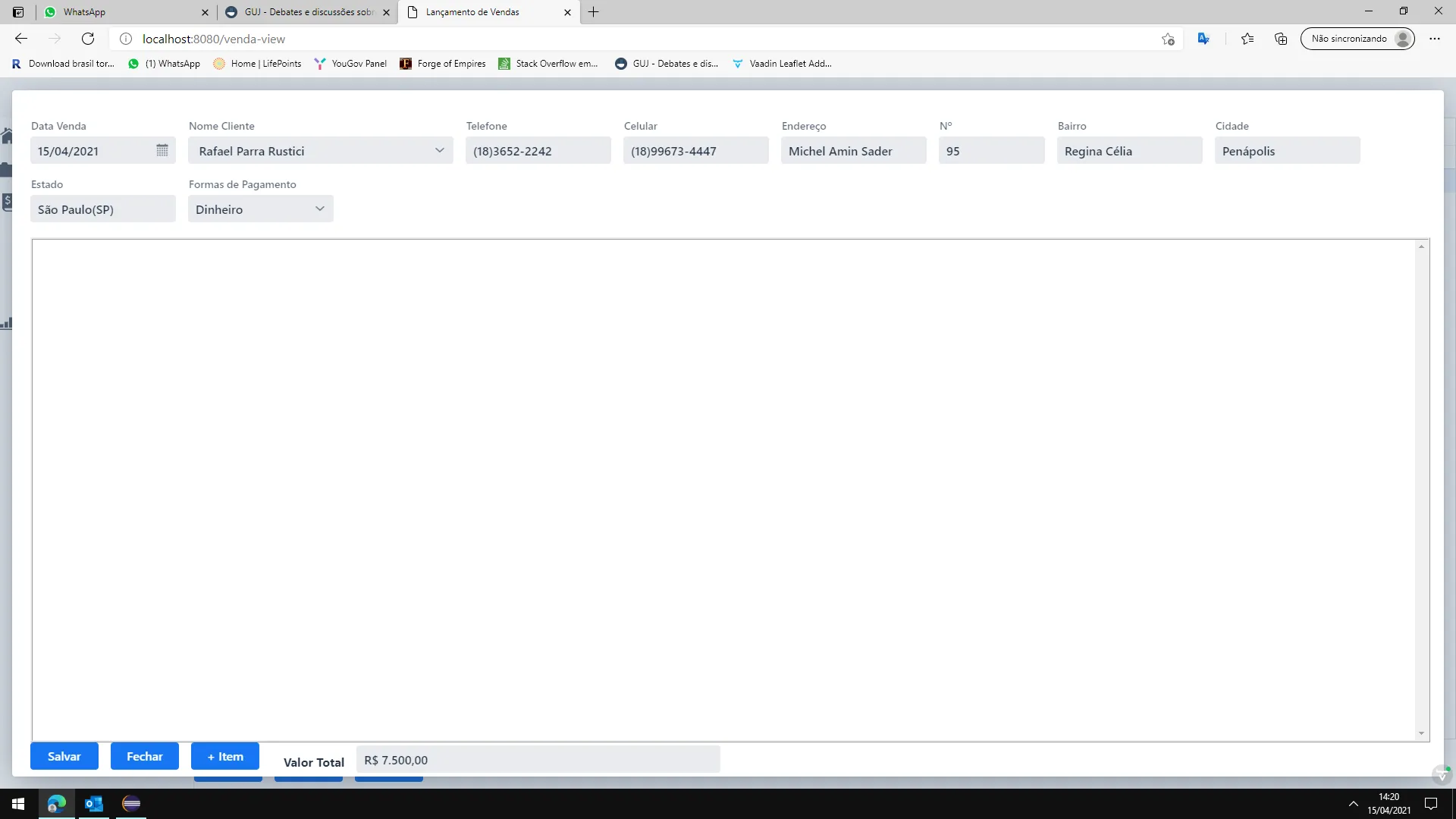 clico em “+ Item” para adicionar os produtos(quantos forem necessários)