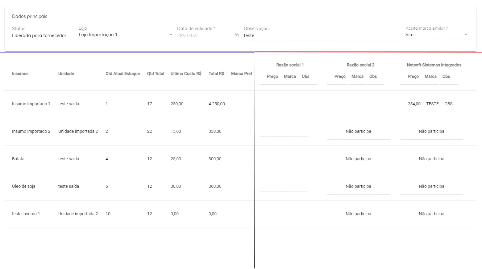 <divclass="table"><table><thead><tr><thalign="center">Insumos</th><thalign="center">Unidade</th><thalign="center">QtdAtualEstoque</th><thalign="center">QtdTotal</th><thalign="center">UltimoCustoR$</th><thalign="center">TotalR$</th><thalign="center">MarcaPref</th><th*ngFor="let fornecedor of fornecedores"><divalign="center">{{fornecedor.razaoSocial}}</div><table><thead><tr><thalign="center">Preço</th><thalign="center">Marca</th><thalign="center">Obs</th></tr></thead></table></th></tr></thead><tbody><tr*ngFor="let item of itens"><td>{{item.nomeInsumo}}</td><td>{{item.nomeUnidade}}</td><td>{{item.quantidadeEstoque}}</td><td>{{item.quantidade}}</td><td>{{item.ultimoCusto|currency}}</td><td>{{item.total|currency}}</td><td>{{item.marca}}</td><td*ngFor="let fornecedorItem of item.fornecedoresItens"><table><tbody><tr><tdclass="tabelaValor">{{fornecedorItem.valor|currency}}</td><tdalign="center">{{fornecedorItem.marca}}</td><tdalign="center">{{fornecedorItem.observacao}}</td></tr></tbody></table></td></tr></tbody></table></div>