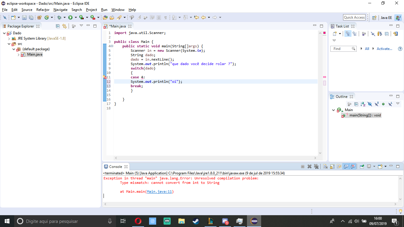O objeto “dado” é uma String. Assim sendo, você é obrigado a colocar String nos cases.
