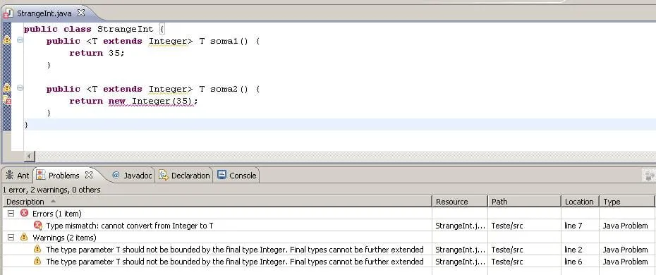 Dá erro porque, quando digo , estou querendo dizer: “meu retorno é um Integer ou qualquer subclasse de Integer”. É claro que isso é só teoria, na prática, por Integer ser final, não existe uma sublasse pra ela. Mas, se fizéssemos assim: