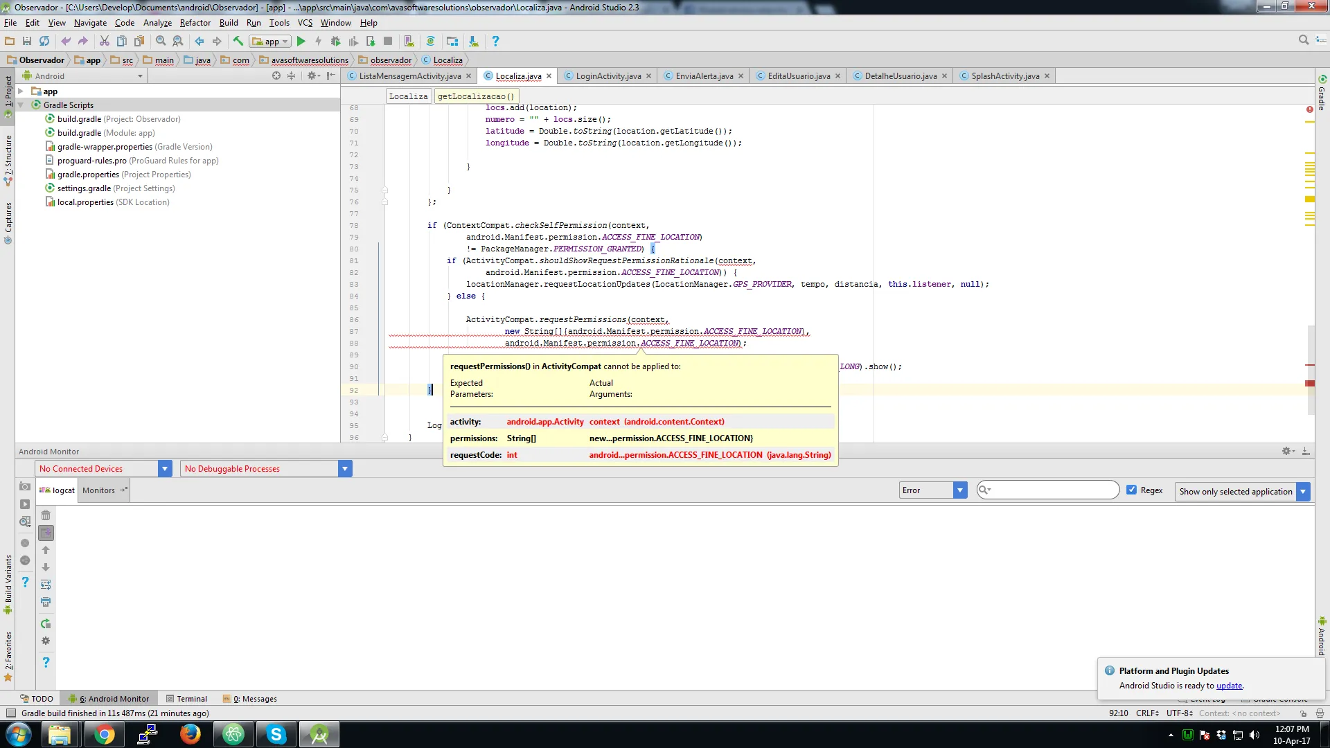 if(ContextCompat.checkSelfPermission(context,android.Manifest.permission.ACCESS_FINE_LOCATION)!=PackageManager.PERMISSION_GRANTED){if(ActivityCompat.shouldShowRequestPermissionRationale(context,android.Manifest.permission.ACCESS_FINE_LOCATION)){locationManager.requestLocationUpdates(LocationManager.GPS_PROVIDER,tempo,distancia,this.listener,null);}else{ActivityCompat.requestPermissions(context,newString[]{android.Manifest.permission.ACCESS_FINE_LOCATION},android.Manifest.permission.ACCESS_FINE_LOCATION);Toast.makeText(context,"Aprova ae sangue bom! para de frescura",Toast.LENGTH_LONG).show();}}