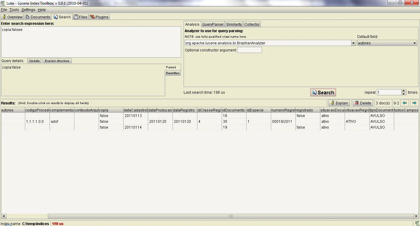 No Luke é possivel ver o bug. No anexo 1, é a imagem com a execução da consulta copia:false. E no segundo a execução da consulta copia:falsee