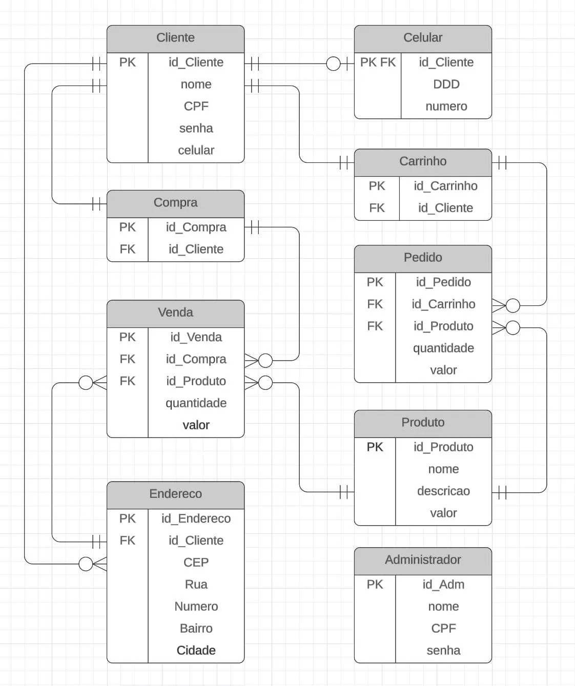 Tenho o seguinte cenário; Existe uma entidade (Carrinho) que armazena (Pedidos) que por sua vez possuem o ID do (Produto) que armazenam. Também, existe uma entidade (Compras) que armazena (Vendas), que por sua vez também possui o ID do (Produto) que foi vendido e o ID do (Endereço) para qual foi enviado. Diagrama ER: