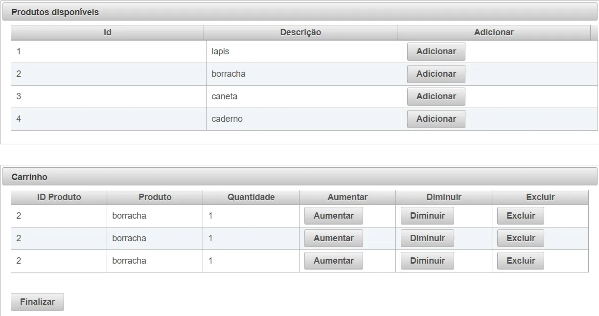 <p:panel header=“Produtos disponíveis”> <p:dataTable var=“produto” value="#{produtoMB.produtos}" scrollable=“true” scrollWidth=“1200px” scrollHeight=“200”> <p:column headerText=“Id”> <h:outputText value="#{produto.id}" /> </p:column><p:column headerText="Descrição"> <h:outputText value="#{produto.descricao}" /> </p:column> <p:column headerText="Adicionar"> <p:commandButton value="Adicionar" id="carrinho" action="#{CarrinhoMB.adicionarCarrinho(produto)}" styleClass="ui-priority-primary" ajax="false"/> </p:column> </p:dataTable> </p:panel> <br></br> <br></br> <p:panel header="Carrinho"> <p:dataTable var="carrinho" value="#{CarrinhoMB.carrinho}"> <p:column headerText="ID Produto"> <h:outputText value="#{carrinho.p.id}" /> </p:column> <p:column headerText="Produto"> <h:outputText value="#{carrinho.p.descricao}" /> </p:column> <p:column headerText="Quantidade"> <h:outputText value="#{carrinho.quantidade}" /> </p:column> <p:column headerText="Aumentar"> <p:commandButton value="Aumentar" id="aumentar" action="#{CarrinhoMB.aumentar()}" styleClass="ui-priority-primary" ajax="false"/> </p:column> <p:column headerText="Diminuir"> <p:commandButton value="Diminuir" id="diminuir" action="#{CarrinhoMB.diminuir()}" styleClass="ui-priority-primary" ajax="false"/> </p:column> <p:column headerText="Excluir"> <p:commandButton value="Excluir" id="excluir" action="#{CarrinhoMB.removerCarrinho()}" styleClass="ui-priority-primary" ajax="false"/> </p:column> </p:dataTable> <br></br> <br></br> <p:commandButton value="Finalizar" id="finalizar" action="#{CarrinhoMB.finalizarCarrinho()}" styleClass="ui-priority-primary" ajax="false"/>