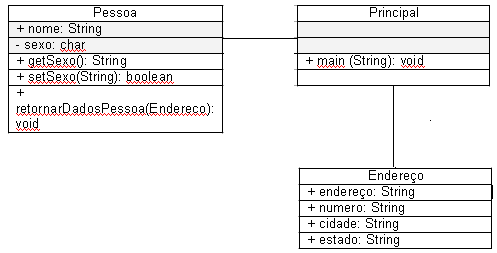 A classe principal instanciará objetos de ambos as classes (Pessoa e Endereco) e atribuirá valores para os atributos destas classes e posteriormente executará o método retornarDadosPessoa.