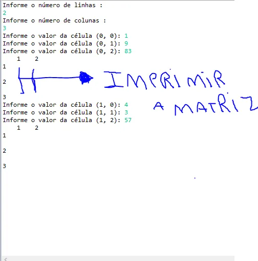 importjava.io.PrintStream;importjava.util.Scanner;publicclassExemplo{publicstaticvoidmain(String[]args)throwsException{Exemploprograma=newExemplo();programa.executar();}privatefinalScannerentrada=newScanner(System.in);privatefinalPrintStreamsaida=System.out;publicvoidexecutar(){saida.println("Informe o número de linhas : ");intlinhas=entrada.nextInt();saida.println("Informe o número de colunas : ");intcolunas=entrada.nextInt();int[][]matriz=newint[linhas][colunas];lerCelulas(matriz);imprimir(matriz);}privatevoidimprimir(int[][]matriz){intlinhas=matriz.length;intcolunas=matriz[0].length;intdigitos=String.valueOf(linhas*colunas).length()+1;Stringformato="%"+digitos+"s";saida.printf(formato," ");for(intcoluna=0;coluna<colunas;coluna++){saida.printf(formato,coluna);}saida.println();for(intlinha=0;linha<linhas;linha++){saida.printf(formato,linha);for(intcoluna=0;coluna<colunas;coluna++){saida.printf(formato,matriz[linha][coluna]);}saida.println();}}privatevoidlerCelulas(int[][]matriz){for(intlinha=0;linha<matriz.length;linha++){for(intcoluna=0;coluna<matriz[linha].length;coluna++){saida.print("Informe o valor da célula ("+linha+", "+coluna+"): ");matriz[linha][coluna]=entrada.nextInt();}}}}