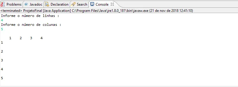 publicstaticvoidmain(String[]args){intlinhas,colunas;intvetor1[];intvetor2[];System.out.println("Informe o número de linhas : ");linhas=(newScanner(System.in)).nextInt();System.out.println("Informe o número de colunas : ");colunas=(newScanner(System.in)).nextInt();vetor1=newint[linhas];vetor2=newint[colunas];System.out.println();for(inti=0;i<vetor1.length;i++){System.out.print(" "+(i+1));}for(intj=0;j<vetor2.length;j++){System.out.println();System.out.println(j+1);}}