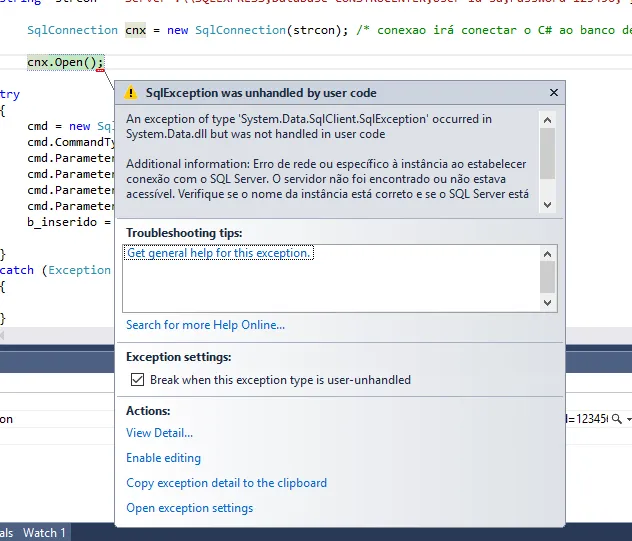 O servidor SQLServer está fora ou o endereço está errado !!! Ele não está chegando no servidor de Banco …