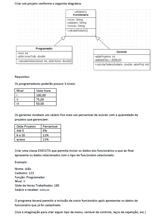 packagePrimeiraEntrada;publicabstractclassFuncionario{privateStringnome;privateStringcadastro;privateStringfuncao;publicabstractcalcularSalario(){}publicStringgetNome(){returnnome;}publicvoidsetNome(Stringnome){this.nome=nome;}publicStringgetCadastro(){returncadastro;}publicvoidsetCadastro(Stringcadastro){this.cadastro=cadastro;}publicStringgetFuncao(){returnfuncao;}publicvoidsetFuncao(Stringfuncao){this.funcao=funcao;}}packagePrimeiraEntrada;publicclassProgramadorextendsFuncionario{privateintnivel;privatedoubleqtdeHorasTrab;privatedoublesalario;publicabstractcalcularSalario(){if(this.getNivel()==1){this.salario=100*this.getQtdeHorasTrab();}else{if(this.getNivel()==2){this.salario=75*this.getQtdeHorasTrab();}else{if(this.getNivel()==3){this.salario=50*this.getQtdeHorasTrab();}}}}publicintgetNivel(){returnnivel;}publicvoidsetNivel(intnivel){this.nivel=nivel;}publicdoublegetQtdeHorasTrab(){returnqtdeHorasTrab;}publicvoidsetQtdeHorasTrab(doubleqtdeHorasTrab){this.qtdeHorasTrab=qtdeHorasTrab;}publicdoublegetSalario(){returnsalario;}publicvoidsetSalario(doublesalario){this.salario=salario;}}packagePrimeiraEntrada;publicclassGerenteextendsFuncionario{privateintqtdeProjetos;privatedoublesalario;publicabstractcalcularSalario(){if(this.getQtdeProjetos()!=0&&this.getQtdeProjetos()<=5){this.salario=9500.*0.08+9500;}else{if(this.getQtdeProjetos()>5&&this.getQtdeProjetos()<=10){this.salario=9500.00*0.12+9500;}else{if(this.getQtdeProjetos()>10){this.salario=9500.00*0.21+9500;}}}}publicintgetQtdeProjetos(){returnqtdeProjetos;}publicvoidsetQtdeProjetos(intqtdeProjetos){this.qtdeProjetos=qtdeProjetos;}publicdoublegetSalario(){returnsalario;}publicvoidsetSalario(doublesalario){this.salario=salario;}}packagePrimeiraEntrada;importjavax.swing.JOptionPane;publicclassExecuta{Funcionariofunc=newFuncionario();Programadorprog=newProgramador();Gerentegere=newGerente();inti=1;while(i!=0){func.setNome(JOptionPane.showInputDialog("\nInsira seu Nome:"));func.setCadastro(JOptionPane.showInputDialog("Insira Cadastro:"));func.setFuncao(JOptionPane.showInputDialog("Insira funcao.\nGerente ou Programador:"));if(func.getFuncao().equals("Gerente")||func.getFuncao().equals("gerente")){gere.setQtdeProjetos(Integer.parseInt(JOptionPane.showInputDialog(null,"Projetos de Gerencia")));gere.calcularSalario();JOptionPane.showMessageDialog(null,"Nome: "+func.getNome()+"\nCadastro: "+func.getCadastro()+"\nFunção: "+func.getFuncao()+"\nQuantidade de Projetos: "+gere.getQtdeProjetos()+"\nSalario: R$"+gere.getSalario());}else{if(func.getFuncao().equals("Programador")||func.getFuncao().equals("programador")){prog.setNivel(Integer.parseInt(JOptionPane.showInputDialog(null,"Qual o seu nível na empresa?")));prog.setQtdeHorasTrab(Double.parseDouble(JOptionPane.showInputDialog(null,"Qual a carga horária?")));prog.calcularSalario();JOptionPane.showMessageDialog(null,"Nome: "+func.getNome()+"\nCadastro: "+func.getCadastro()+"\nFunção: "+func.getFuncao()+"\nNivel: "+prog.getNivel()+"\nCarga horária: "+prog.getQtdeHorasTrab()+" Horas"+"\nSalario: R$"+prog.getSalario());}}i=JOptionPane.showConfirmDialog(null,"Deseja continuar?");if(i==JOptionPane.YES_OPTION){i=1;}else{i=0;JOptionPane.showMessageDialog(null,"Programa encerrado");}}}}
