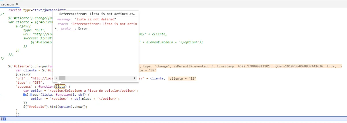 $('#cliente').change(function(e){