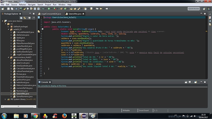 Pessoal boa noite, sou novo aqui e tambem estou começando na área de programação, então peço que me desculpem por qualquer erro aqui no fórum desde já. Bom é o seguinte, estou fazendo um curso on line e estou tendo dificuldade em interpretar uma mensagem (ponto de exclamação e uma lâmpada) em todas as classes que crio, estou enviando uma imagem onde mostra isso, e uma variável que crio tambem fica sublinhada, acho que essa mensagem tem a ver com a variável(scan), que está criada, alguem poderia por favor me esclarecer o porque está acontecendo isso e como corrigir?
