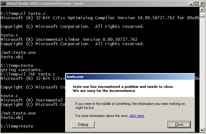 Sem a opção /GF, ele roda do jeito que você achou que tinha de rodar (imprime "qtring constante"). Com /GF, o programa morre: