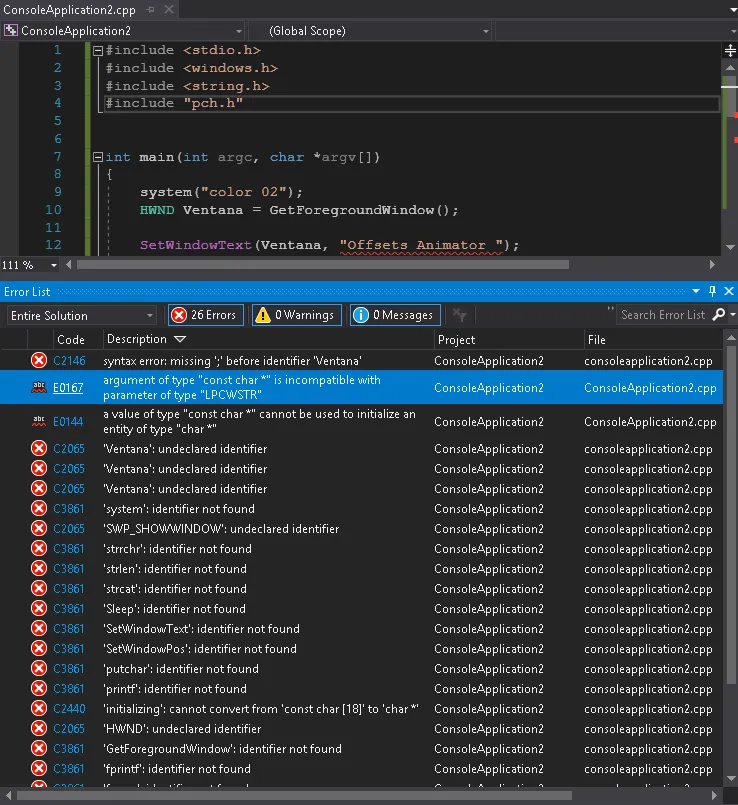 Venho estudando que nem doido(literalmente) C++… gostei da linguagem, até por que já tinha semelhança aproximada por estar estudando antes C#, e agora que passei pra C++ eu acabei tendo que trocar de IDE. Pelo simples fato que qualquer código basico que eu tento compilar e executar no Visual Studio em c++ ele me gera uma penca de erros e eu não faço ideia de onde vem isso, acabei baixando tudo que tinha C++ como nome pelo instalador dele pra ver se resolvia e nada resolveu… ): eu gosto muito do VS pelo simples fato que tenho muita facilidade e acho prático na hora de codar, a forma como o ponteiro se posiciona e a facilidade que tenho de locomover ele é bem mais ágil em relação às outras IDE’s, sem falar na “ajudinha” que ele dá mostrando as possibilidades ao digitar uma primeira letra ou coisas do tipo, enfim, esse print abaixo mostra os erros de um simples código que criava um ponteiro, dentro do mesmo tinha um texto escrito “Offset funcionando” e digitava na tela pra mim de acordo com o tempo do Sleep();…