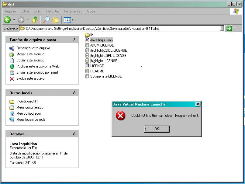 Cara vá pelo DOS até a pasta onde vc descompactou o Java.Inquisition.jar