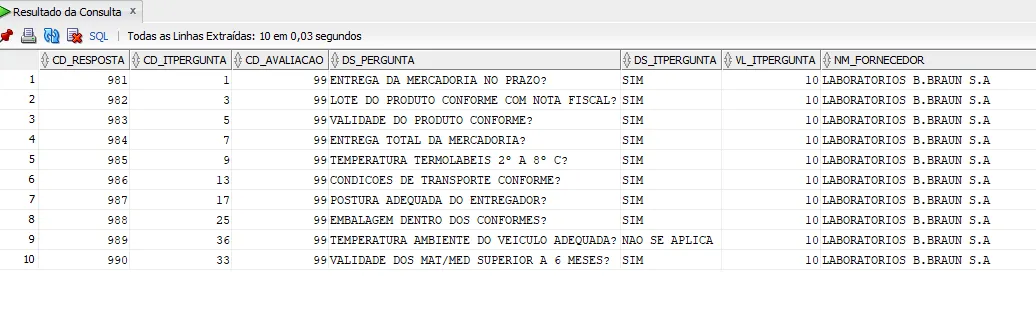 Estou tentando montar um relatório que me traga as 10 avaliações por fornecedor. Montei a query e tals e ta trazendo tudo de boas. Toda execução que eu fizer independente do fornecedor, me trará 10 avaliações, cada um com uma nota. Porém pra cada nota (VL_ITPERGUNTA), existe um peso que eu preciso multiplicar. Por exemplo: linha 1 multiplica por 10, linha 2 multiplica por 5, linha 3 multiplica por 10 e por aí vai até a décima linha.