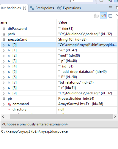boolean backupDB = backup.backupDB("bd_relatorios", "root", "", "C:\\Users\\Gabriel\\Documents\\Nova pasta (2)\\das");