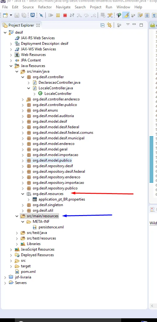 18:57:07,192SEVERE[javax.enterprise.resource.webcontainer.jsf.application](defaulttask-3)ErrorRenderingView[/configuracao/endereco/bairro/bairro.xhtml]:java.util.MissingResourceException:Can't find bundle for base name org.desif.resources, locale pt_BR at java.util.ResourceBundle.throwMissingResourceException(Unknown Source) [rt.jar:1.8.0_121] at java.util.ResourceBundle.getBundleImpl(Unknown Source) [rt.jar:1.8.0_121] at java.util.ResourceBundle.getBundle(Unknown Source) [rt.jar:1.8.0_121] at com.sun.faces.util.MessageFactory.getMessage(MessageFactory.java:161) [jsf-impl-2.2.5-jbossorg-3.jar:] at com.sun.faces.util.MessageFactory.getMessage(MessageFactory.java:136) [jsf-impl-2.2.5-jbossorg-3.jar:] at com.sun.faces.util.MessageUtils.getExceptionMessageString(MessageUtils.java:388) [jsf-impl-2.2.5-jbossorg-3.jar:] at com.sun.faces.mgbean.BeanBuilder.newBeanInstance(BeanBuilder.java:188) [jsf-impl-2.2.5-jbossorg-3.jar:] at com.sun.faces.mgbean.BeanBuilder.build(BeanBuilder.java:100) [jsf-impl-2.2.5-jbossorg-3.jar:] at com.sun.faces.mgbean.BeanManager.createAndPush(BeanManager.java:409) [jsf-impl-2.2.5-jbossorg-3.jar:] at com.sun.faces.mgbean.BeanManager.create(BeanManager.java:269) [jsf-impl-2.2.5-jbossorg-3.jar:] at com.sun.faces.el.ManagedBeanELResolver.resolveBean(ManagedBeanELResolver.java:257) [jsf-impl-2.2.5-jbossorg-3.jar:] at com.sun.faces.el.ManagedBeanELResolver.getValue(ManagedBeanELResolver.java:117) [jsf-impl-2.2.5-jbossorg-3.jar:] at com.sun.faces.el.DemuxCompositeELResolver._getValue(DemuxCompositeELResolver.java:176) [jsf-impl-2.2.5-jbossorg-3.jar:] at com.sun.faces.el.DemuxCompositeELResolver.getValue(DemuxCompositeELResolver.java:203) [jsf-impl-2.2.5-jbossorg-3.jar:] at com.sun.el.parser.AstIdentifier.getValue(AstIdentifier.java:116) [javax.el-3.0.0.jar:3.0.0] at com.sun.el.parser.AstValue.getBase(AstValue.java:151) [javax.el-3.0.0.jar:3.0.0] at com.sun.el.parser.AstValue.getValue(AstValue.java:200) [javax.el-3.0.0.jar:3.0.0] at com.sun.el.parser.AstDeferredExpression.getValue(AstDeferredExpression.java:63) [javax.el-3.0.0.jar:3.0.0] at com.sun.el.parser.AstCompositeExpression.getValue(AstCompositeExpression.java:68) [javax.el-3.0.0.jar:3.0.0] at com.sun.el.ValueExpressionImpl.getValue(ValueExpressionImpl.java:226) [javax.el-3.0.0.jar:3.0.0] at org.jboss.weld.el.WeldValueExpression.getValue(WeldValueExpression.java:50) [weld-core-impl-2.1.2.Final.jar:2014-01-09 09:23] at org.jboss.weld.el.WeldValueExpression.getValue(WeldValueExpression.java:50) [weld-core-impl-2.1.2.Final.jar:2014-01-09 09:23] at com.sun.faces.facelets.el.TagValueExpression.getValue(TagValueExpression.java:109) [jsf-impl-2.2.5-jbossorg-3.jar:] at javax.faces.component.ComponentStateHelper.eval(ComponentStateHelper.java:194) [jboss-jsf-api_2.2_spec-2.2.5.jar:2.2.5] at javax.faces.component.UIComponentBase.isRendered(UIComponentBase.java:457) [jboss-jsf-api_2.2_spec-2.2.5.jar:2.2.5] at javax.faces.component.UIComponent.encodeAll(UIComponent.java:1850) [jboss-jsf-api_2.2_spec-2.2.5.jar:2.2.5] at javax.faces.component.UIComponent.encodeAll(UIComponent.java:1859) [jboss-jsf-api_2.2_spec-2.2.5.jar:2.2.5] at javax.faces.component.UIComponent.encodeAll(UIComponent.java:1859) [jboss-jsf-api_2.2_spec-2.2.5.jar:2.2.5] at com.sun.faces.application.view.FaceletViewHandlingStrategy.renderView(FaceletViewHandlingStrategy.java:461) [jsf-impl-2.2.5-jbossorg-3.jar:] at com.sun.faces.application.view.MultiViewHandler.renderView(MultiViewHandler.java:133) [jsf-impl-2.2.5-jbossorg-3.jar:] at org.ocpsoft.rewrite.faces.RewriteViewHandler.renderView(RewriteViewHandler.java:196) [rewrite-integration-faces-3.4.1.Final.jar:3.4.1.Final] at javax.faces.application.ViewHandlerWrapper.renderView(ViewHandlerWrapper.java:337) [jboss-jsf-api_2.2_spec-2.2.5.jar:2.2.5] at javax.faces.application.ViewHandlerWrapper.renderView(ViewHandlerWrapper.java:337) [jboss-jsf-api_2.2_spec-2.2.5.jar:2.2.5] at com.sun.faces.lifecycle.RenderResponsePhase.execute(RenderResponsePhase.java:120) [jsf-impl-2.2.5-jbossorg-3.jar:] at com.sun.faces.lifecycle.Phase.doPhase(Phase.java:101) [jsf-impl-2.2.5-jbossorg-3.jar:] at com.sun.faces.lifecycle.LifecycleImpl.render(LifecycleImpl.java:219) [jsf-impl-2.2.5-jbossorg-3.jar:] at javax.faces.webapp.FacesServlet.service(FacesServlet.java:647) [jboss-jsf-api_2.2_spec-2.2.5.jar:2.2.5] at io.undertow.servlet.handlers.ServletHandler.handleRequest(ServletHandler.java:85) [undertow-servlet-1.0.0.Final.jar:1.0.0.Final] at io.undertow.servlet.handlers.FilterHandler$FilterChainImpl.doFilter(FilterHandler.java:130) [undertow-servlet-1.0.0.Final.jar:1.0.0.Final] at org.ocpsoft.rewrite.servlet.RewriteFilter.doFilter(RewriteFilter.java:226) [rewrite-servlet-3.4.1.Final.jar:3.4.1.Final] at io.undertow.servlet.core.ManagedFilter.doFilter(ManagedFilter.java:56) [undertow-servlet-1.0.0.Final.jar:1.0.0.Final] at io.undertow.servlet.handlers.FilterHandler$FilterChainImpl.doFilter(FilterHandler.java:132) [undertow-servlet-1.0.0.Final.jar:1.0.0.Final] at io.undertow.servlet.handlers.FilterHandler.handleRequest(FilterHandler.java:85) [undertow-servlet-1.0.0.Final.jar:1.0.0.Final] at io.undertow.servlet.handlers.security.ServletSecurityRoleHandler.handleRequest(ServletSecurityRoleHandler.java:61) [undertow-servlet-1.0.0.Final.jar:1.0.0.Final] at io.undertow.servlet.handlers.ServletDispatchingHandler.handleRequest(ServletDispatchingHandler.java:36) [undertow-servlet-1.0.0.Final.jar:1.0.0.Final] at io.undertow.server.handlers.PredicateHandler.handleRequest(PredicateHandler.java:25) [undertow-core-1.0.0.Final.jar:1.0.0.Final] at io.undertow.server.handlers.PredicateHandler.handleRequest(PredicateHandler.java:25) [undertow-core-1.0.0.Final.jar:1.0.0.Final] at io.undertow.server.handlers.PredicateHandler.handleRequest(PredicateHandler.java:25) [undertow-core-1.0.0.Final.jar:1.0.0.Final] at io.undertow.servlet.handlers.ServletInitialHandler.dispatchRequest(ServletInitialHandler.java:229) [undertow-servlet-1.0.0.Final.jar:1.0.0.Final] at io.under