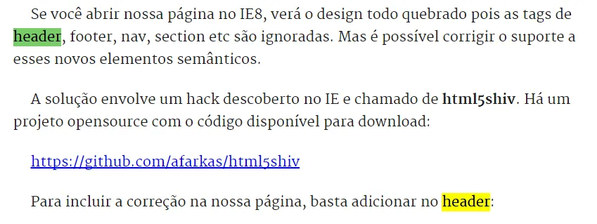 Olá @stearruda tudo bem?Você tem razão, a declaração do html5shiv precisa estar na tag “head” pois é uma configuração onde não fica visível para o usuário no corpo do HTML. Qual capitulo da apostila está mostrando que a declaração está na Tag “header”?