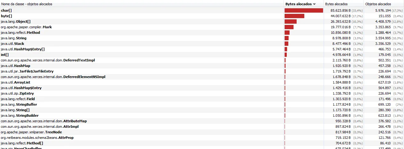 Executei o profiler do Netbeans e testo as funcionalidades da minha aplicação. Depois de um tempo, as classes char[] e byte[] juntas ocupam algo em torno de 130MB. Isso é normal?? Já verifiquei o código e não consigo achar locais onde pode haver alguma estrutura de iteração infinita ou algo do tipo, mas estou acumulando esses 130MB com somente 1 usuário logado. Imagina o publicado com mais usuários.