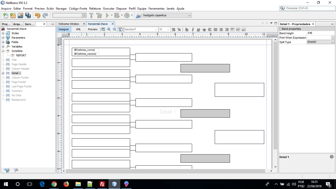 Olá. Estou desenvolvendo uma aplicação de chave para campeonato de luta no Ireport. A dificuldade que tenho é gerar a chave em uma única folha. A ideia é escolher no Select uma categoria e todos que estiverem cadastrado nela entram na chave. A minha dúvida é primaria. Como monto uma variação para que seja colocado nome e equipe dentro de cada chave SEPARADAMENTE?