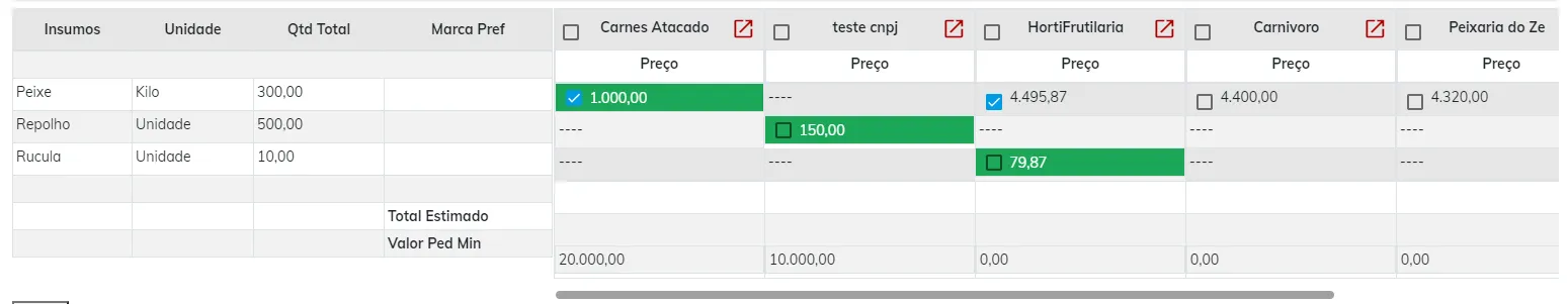 Nesse componente, tu tem o insumo e os fornecedores. Se tu mantesse uma estrutura insumo X fornecedores, para controlar qual fornecedor foi selecionado para determinado insumo, acredito que iria facilitar a manipulação dos dados. Algo assim: