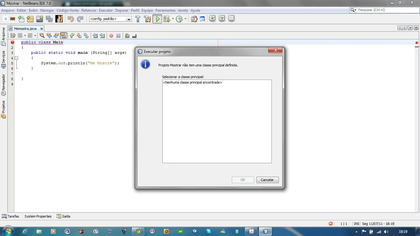 Bom… Desse jeito acima não tem como. Pois a classe que eu defini no NetBeans se chama Memostra. Portanto, ela deve ter esse nome. Para definí-la como principal, eu coloquei o public static void main(String [] args).