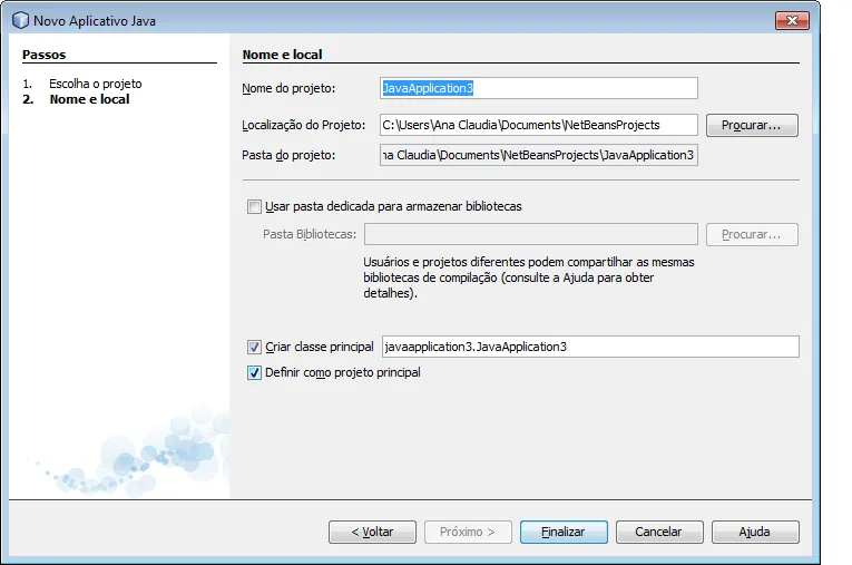 Sigo os passos File> new project> java> java app> next> coloco o nome do projeto> finish