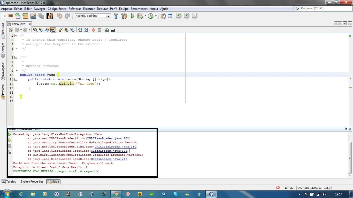 O problema é que o NetBeans, quando eu vou compilar, mostra uma mensagem dizendo que está sem classe principal.