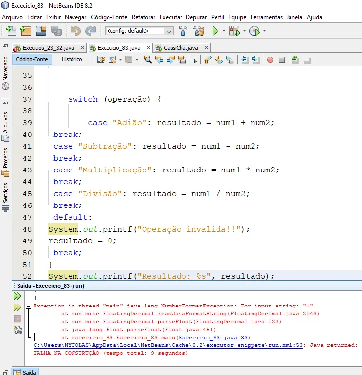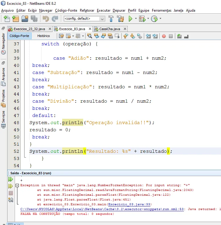System.out.printf("Resultado e: ",(operação)); --> essa parte não amostra o resultado, não faço a minima ideia do que esta errado