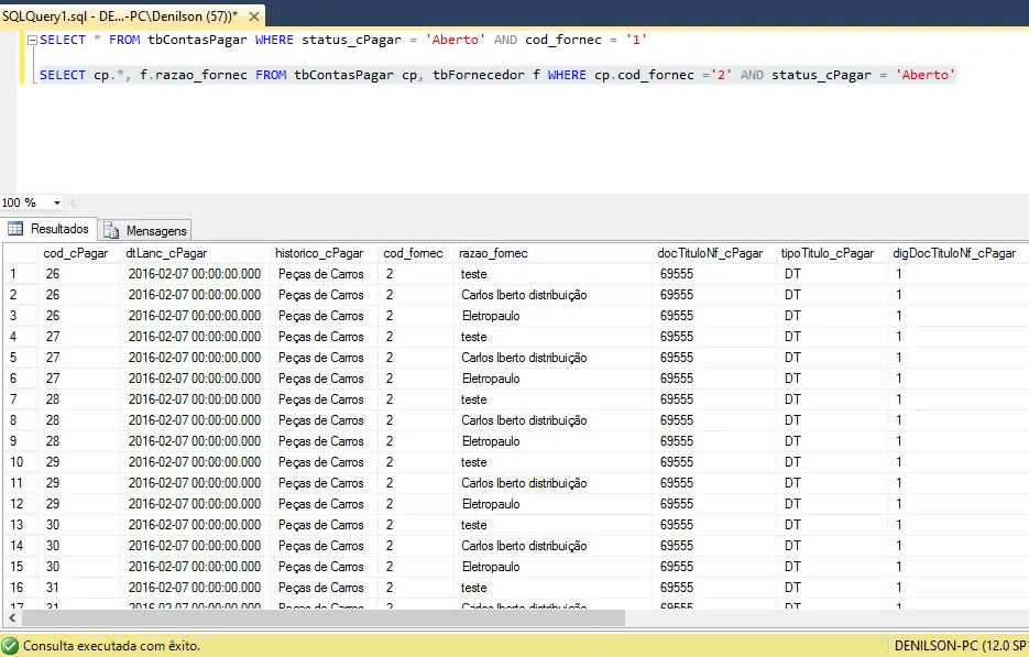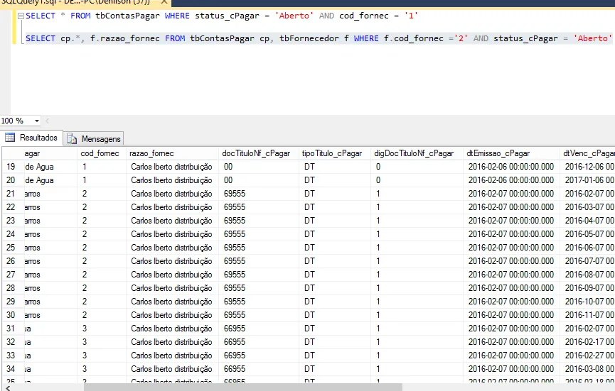 SELECT cp.*, f.razao_fornec FROM tbContasPagar cp, tbFornecedor f WHERE cp.cod_fornec = f.cod_fornec AND status_cPagar = ‘Aberto’ AND cod_fornec = ‘1’