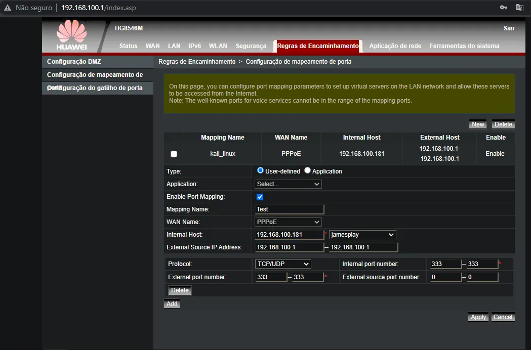 Olá Pessoal, estou tentando abrir uma porta no meu roteador. Mas ele esta na configuração PPPoE. E não tem como mudar, pois o Roteador esta na configuração que a empresa de Internet colocou, ou seja nem tem como resetar, pois perderia a configuração padrão que a própria provedora estabeleceu.