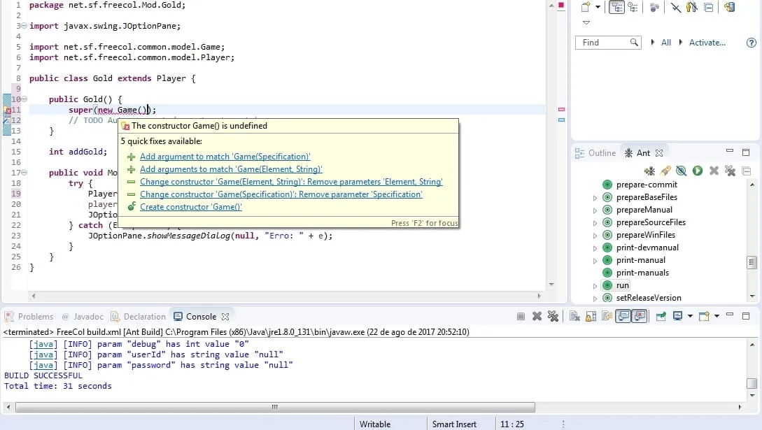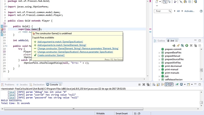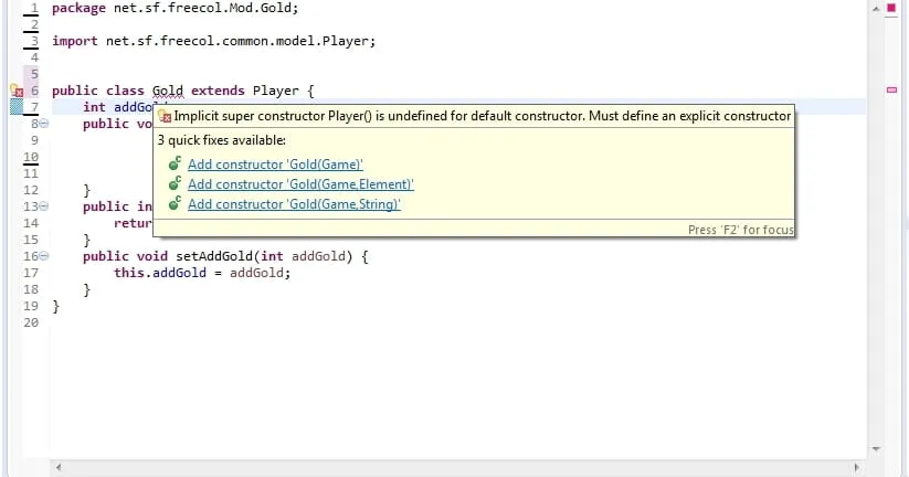Estou alterando o código de um jogo, más estou com muita dificuldade para acessar o método getGold da classe Player, quando eu extendo ela na minha classe, o eclipse me da este erro: