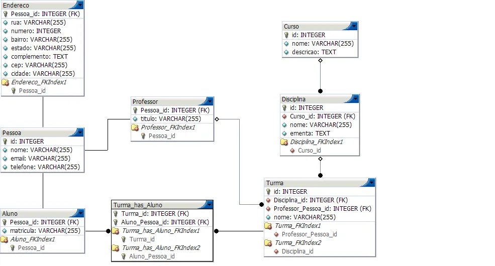 Foi criado uma terceira tabela Turma_has_Aluno que contém os dados de ambas as tabelas para a associação.