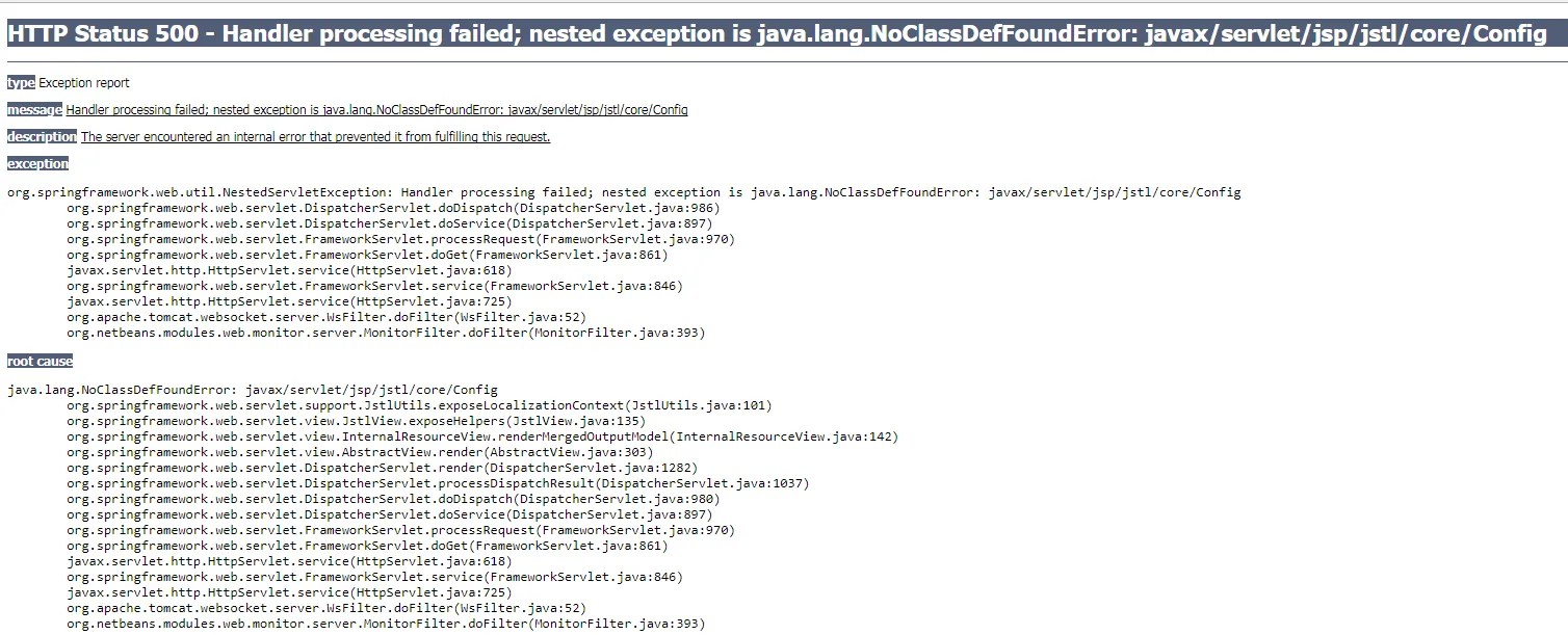 estou criando um projeto web com springMVC e estou tentando utilizar o jsf , mas ele gera um erro ao abrir a página inicial , alguem pode me ajudar ?