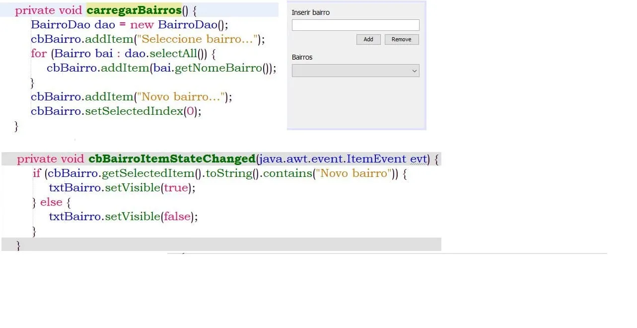 A minha dúvida é a seguinte, o JTextfield fica invisível e pretendo que só fique visível quando no JComboBox estiver selecionado o item "Novo bairro..."consoante o código do evento cbBairroItemStateChanged, mas não fica visível.