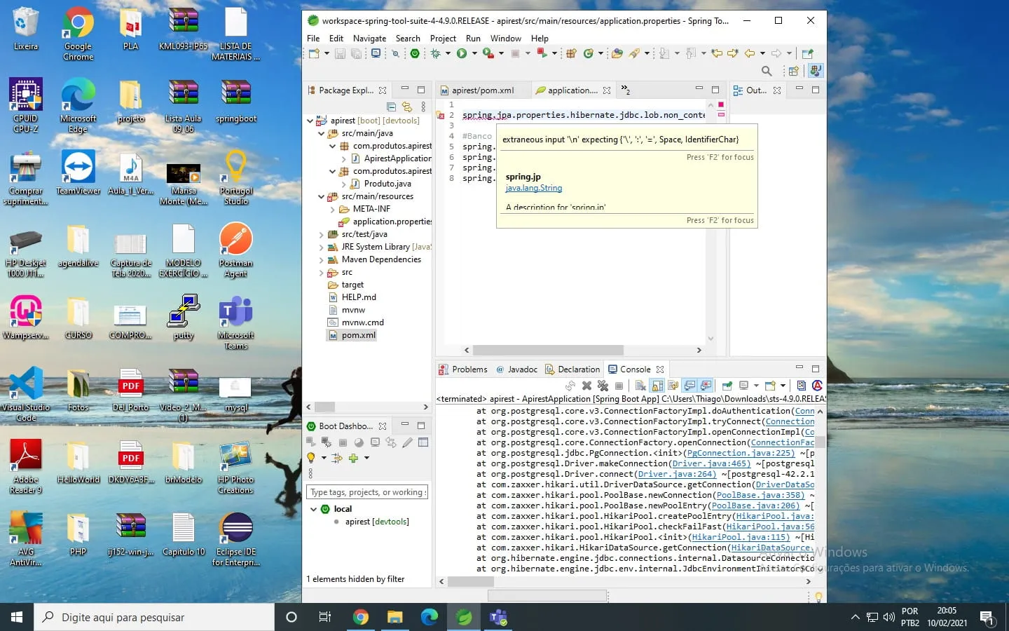 2021-02-10 19:41:35.984 INFO 1892 — [ restartedMain] com.produtos.apirest.ApirestApplication : Starting ApirestApplication using Java 15.0.1 on DESKTOP-M6FGMDT with PID 1892 (C:\Users\Thiago\eclipse-workspace\apirest\target\classes started by Thiago in C:\Users\Thiago\eclipse-workspace\apirest)