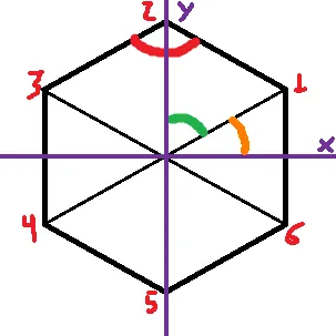 Me refiro ao angulo do primeiro vertice (aquele clicado pelo usuario) em relaçao ao eixo x, portanto o q está em laranja, o verde seria a “parte” (2PI/n) q deve ser adicionado ao primeiro (que está em laranja) para encontrar o vertice seguinte V2, se adicionado novamente encontrará o V3.