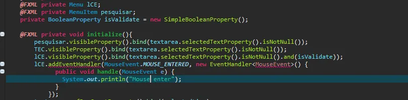Olá. A partir de alguns exemplos, eu adicionei um evento de hover em uma menu no JavaFX, mas até onde eu sei a estrutura está correta, porém o Eclipse está acusando erro.