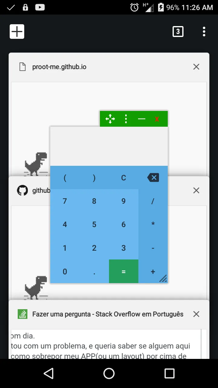 Meus amigos estou com,um problema eu queria saber como faz para abrir uma janela sobre outro aplicativo, como na imagem, a calculadora esta sobre o Google Chrome.