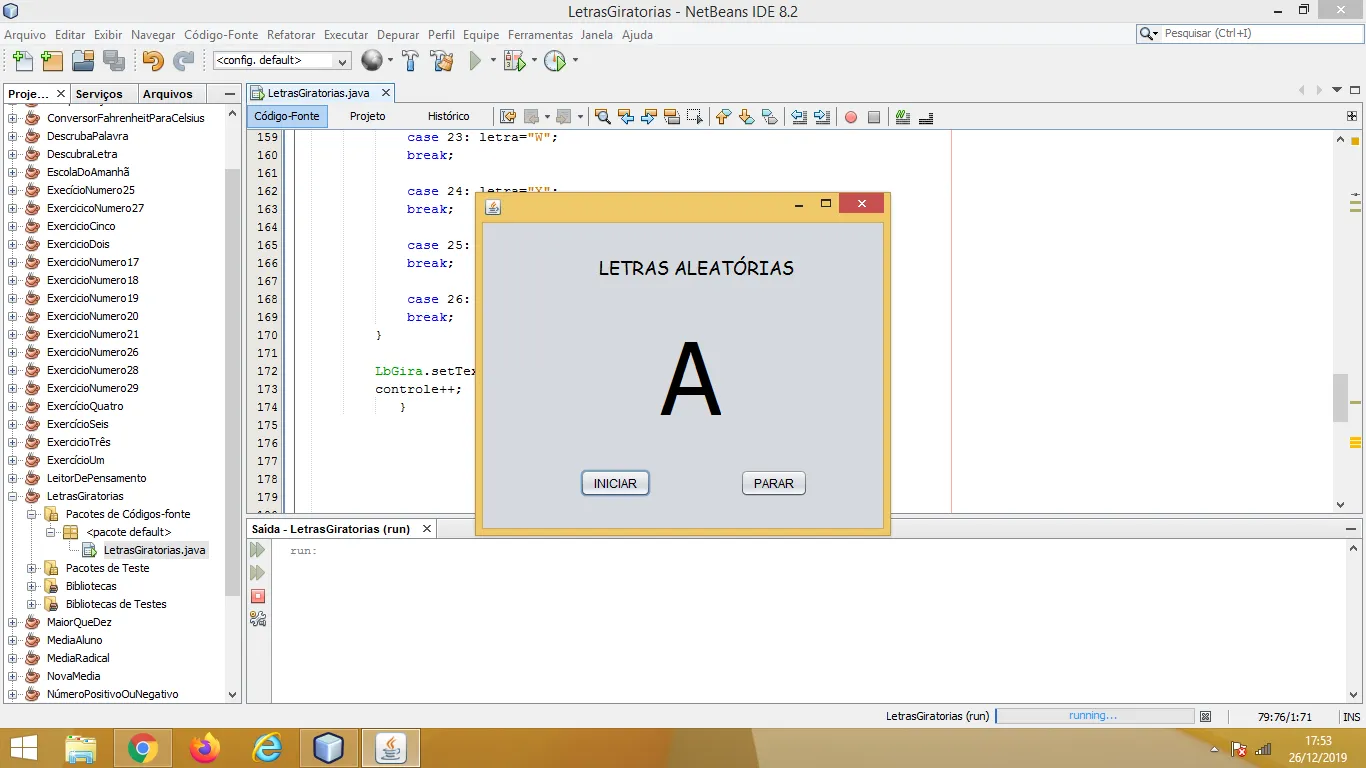 Estou criando um programa em java bem simples utilizando um JFrame , sua função é gerar letras de forma aleatória na tela depois do botão iniciar ter sido apertado.O meu problema é o seguinte : eu aperto o botão de iniciar mas não gera as letras de forma aleatória , mas se eu ficar clicando no botão iniciar elas alteram, então eu queria que fosse de forma automática acionada depois do clique do botão iniciar .