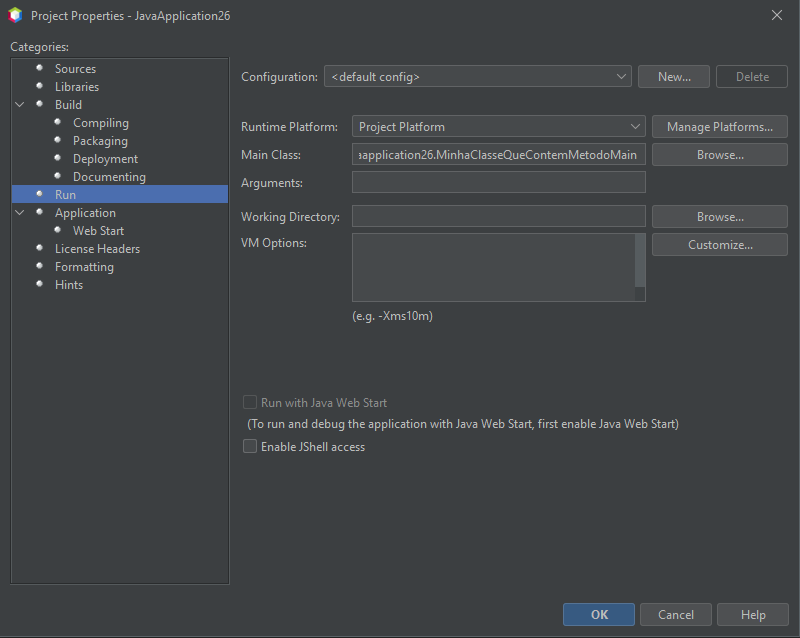Tudo bem, David Buzatto? Bom a classe está declarada junto com o nome do pacote (nomePacote.NomeClasse, da seguinte forma empresavi.EmpresaVI, está correto?) na opção run mas meu projeto não é ant é maven. O NetBeans não gera uma pasta dist (pelo meno eu não achei, talvez não tenha procurado corretamente) ele gera uma pasta target conforme a figura abaixo: