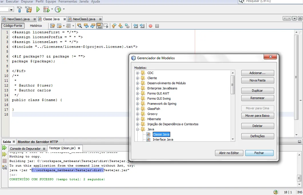 Agora, quero compartilhar com vocês com troquei o nome do autor no Netbeans. Primeiramente, vá em Ferramentas > Modelos, depois clique no botão Configurações, essa ação irá abrir um arquivo chamado User.properties, nele basta você digitar: