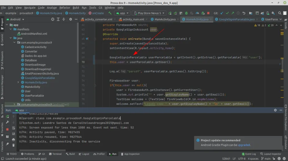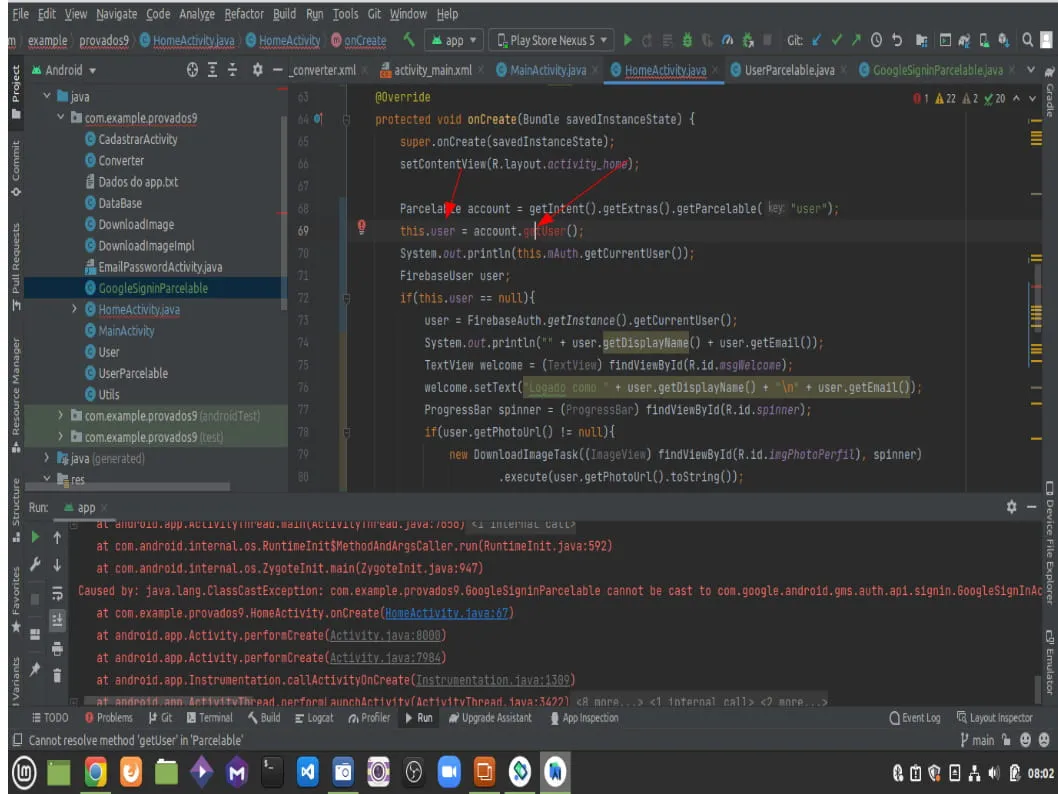 Sim, account é um Parcelable e this.user é do tipo GoogleSigninAccount, então quero atribuir um objeto GoogleSignAccount ao this.user do HomeActivity.java retornado pelo getUser() do Parcelable.